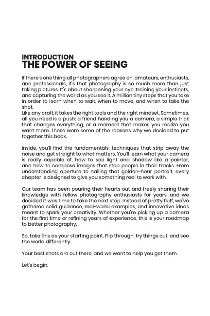 This isn’t a collection of internet tips or social media hacks. It’s a carefully structured resource designed to help you understand photography deeply, so your skills keep improving long after you’ve finished reading.